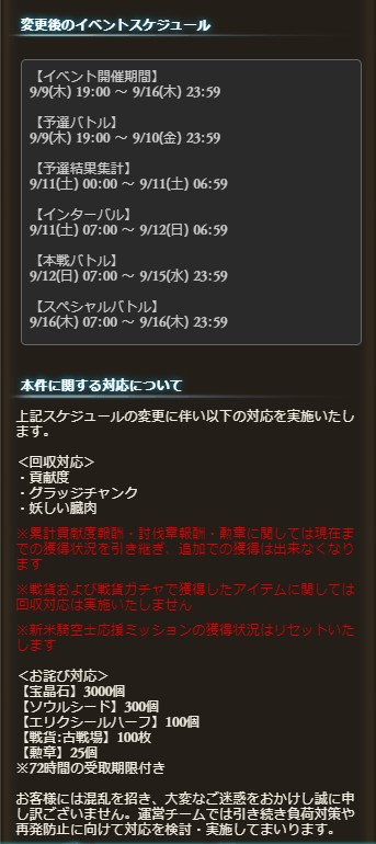 ・お詫びで宝晶石3000個、半汁100個、戦貨100枚、勲章25個