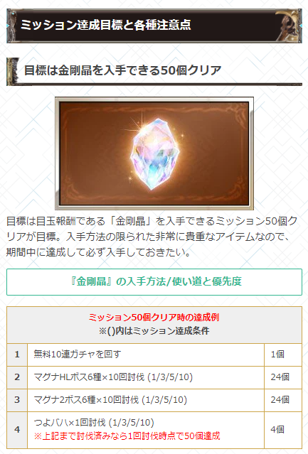 期間中にミッション30個達成でSSRチケ、50個達成で金剛晶を獲得可能!