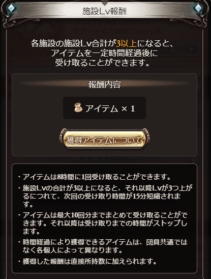 施設Lv合計3以上になると一定時間毎に受け取れるアイテム