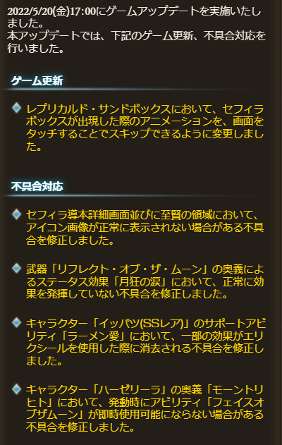 5/20(金)17:00 アップデート内容