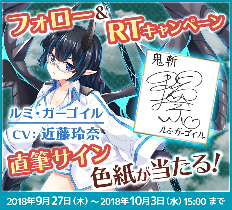 @JP_onigiriをフォロー&このツイートをRTした方から抽選で、ルミ・ガーゴイル役「近藤玲奈」さんの直筆サイン色紙を3名様にプレゼント!