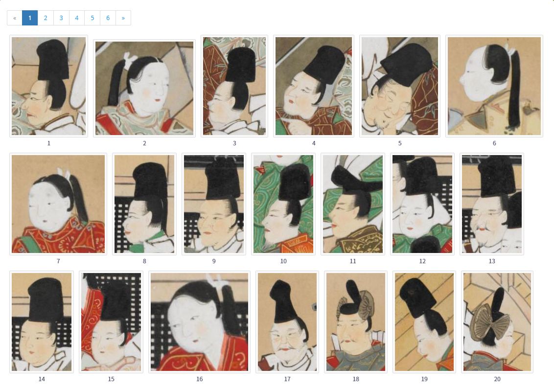 IIIF検索エンジンのプロトタイプとなるIIIF Curation Finderを公開しました。これを活用した「顔貌コレクション」では、IIIFの画像から切り抜いた顔貌を検索できます。例えば「牛若丸」で検索すると、さまざまな絵巻物に描かれた「牛若丸」の顔貌が一覧できます。