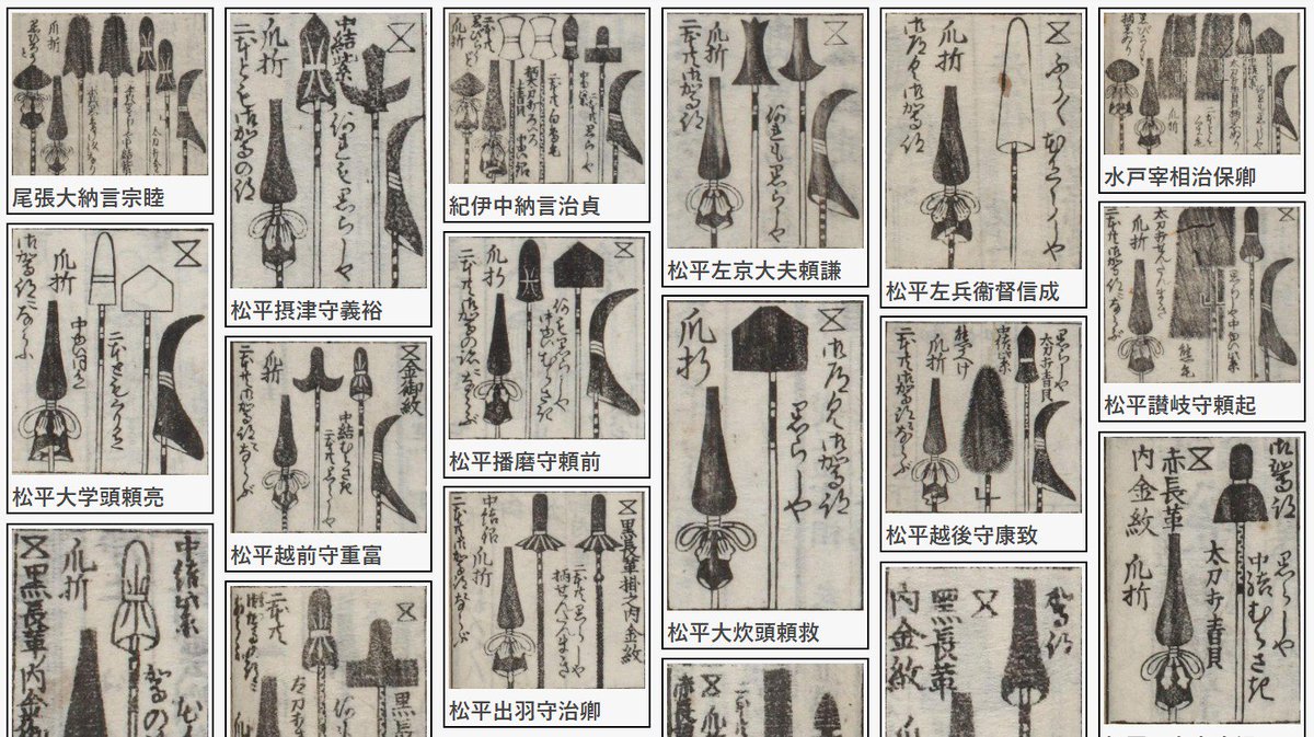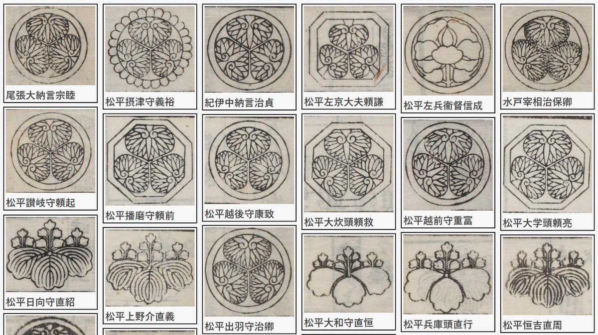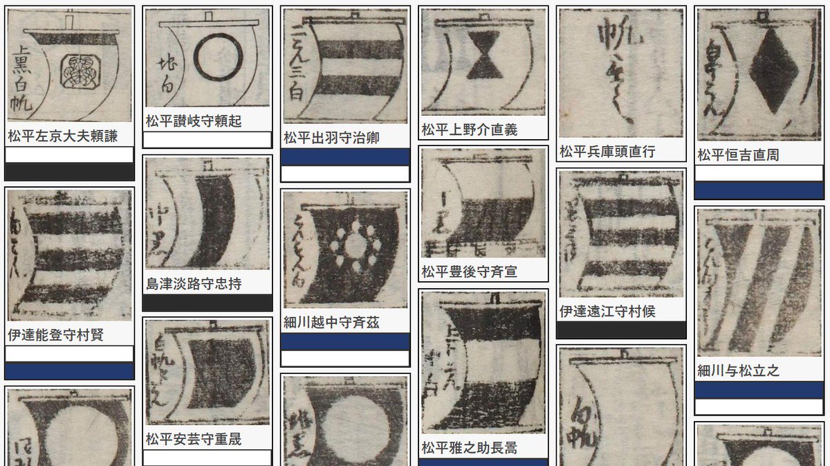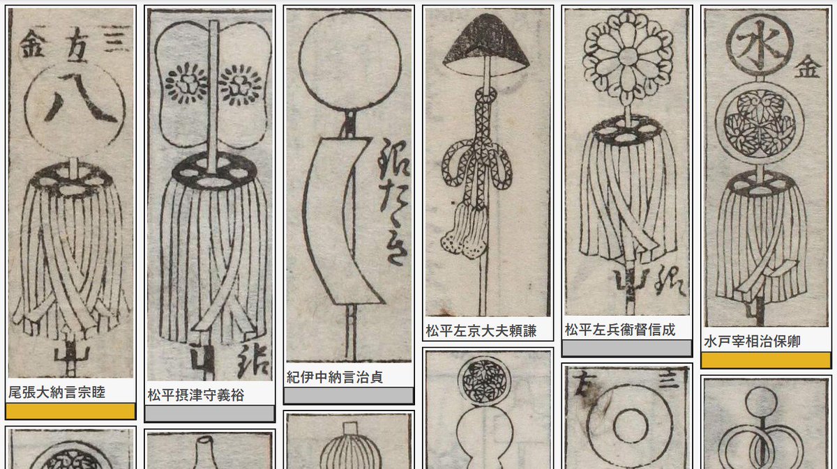 「武鑑全集」の見て楽しむ大名家デザイン集「紋・道具」では、江戸時代(寛政)264大名家それぞれの個性的なデザインを一覧できます。まだ一部ですが、色情報も追加して、色でも検索できるようにしました。添付の画像は「定紋」「行列道具」「纏」「帆幕」です。
