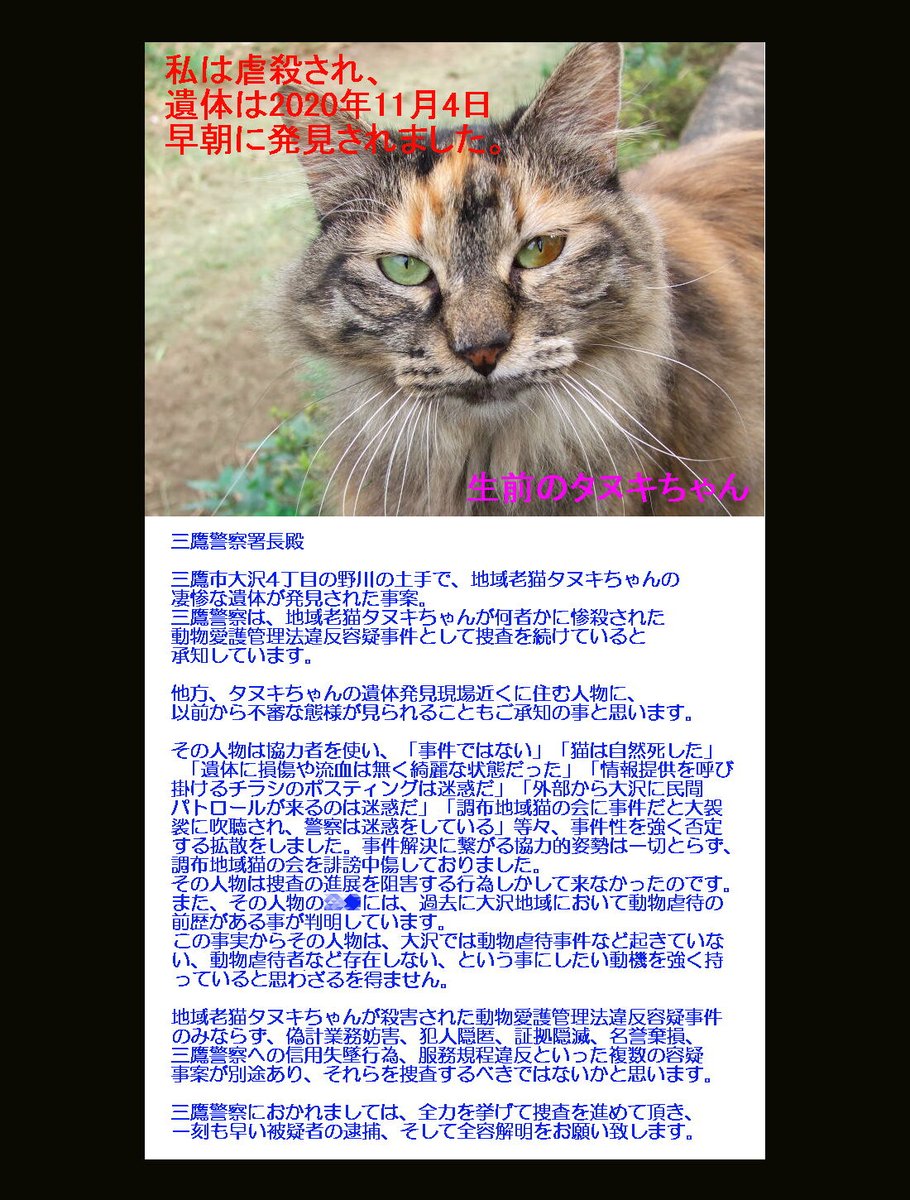 三鷹警察は、地域老猫タヌキちゃん惨殺事件は無かったと事件を隠蔽する拡散を行った三鷹署所属の警官を速やかに逮捕し、厳しく取り調べてください。 twitter.com/ChofuChiikiNek…