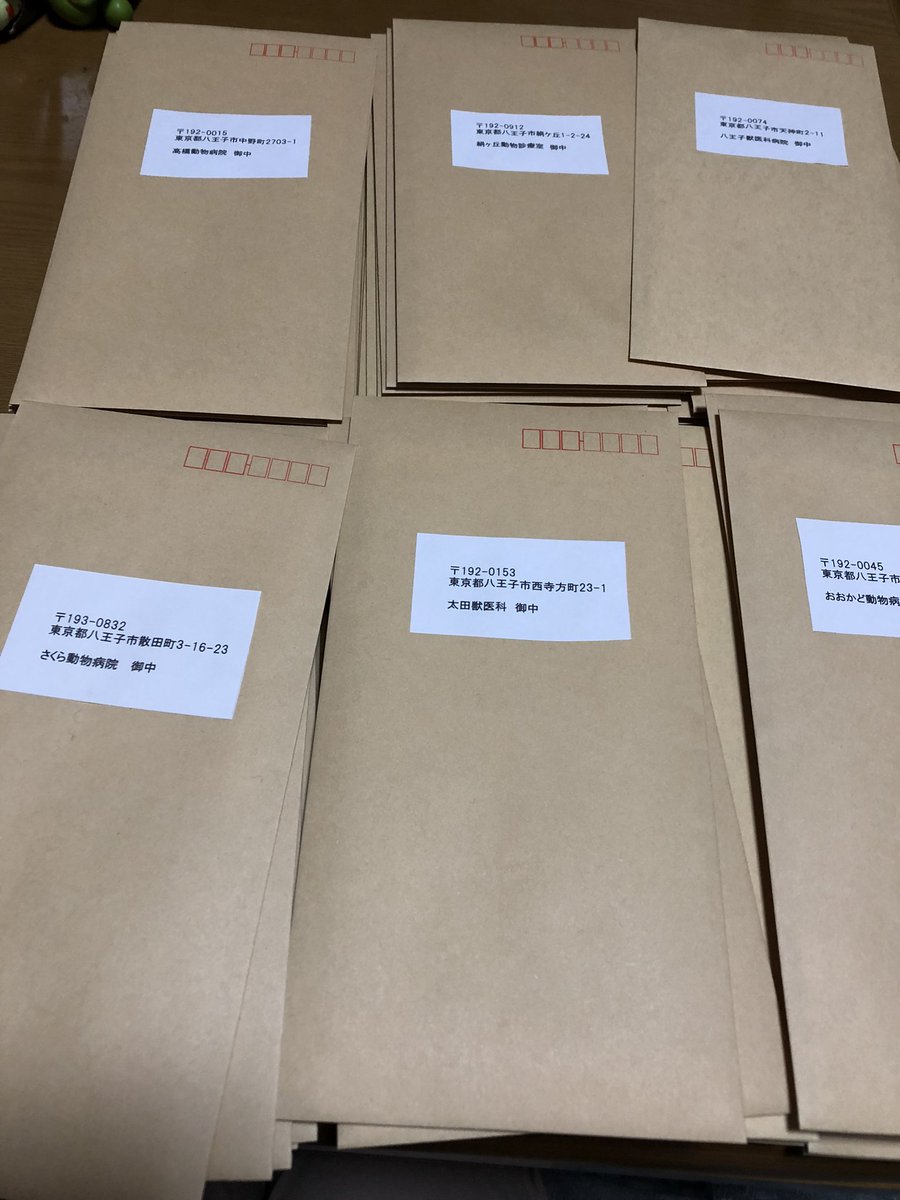 今朝、八王子市内59箇所の動物病院に保護された猫の受診があったら探している人がおり連絡頂きたい事、ノイちゃんのチラシを掲示して欲しい旨の文書入れ発送しました。