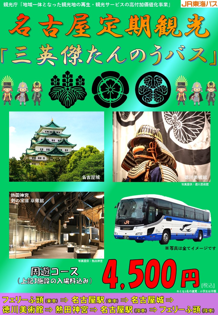 本日より三英傑たんのうバスが運行開始しました。名古屋城、徳川美術館、熱田神宮を巡ります。