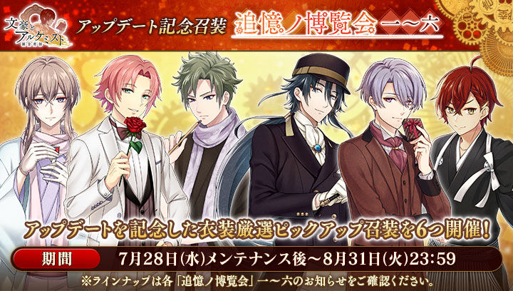 7月28日(水)メンテンス後より、アップデートを記念した召装『追憶ノ博覧会』6種を開催!それぞれの召装では過去に登場した文豪達の衣装を厳選ピックアップいたします。 #文アル