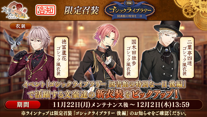 『調査任務「ゴシックライブラリー 図書館の特別な一日 後編」』で活躍する文豪達の衣装をピックアップいたします。