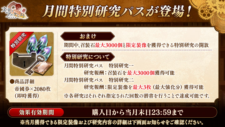 購入すると帝國券2080枚と、おまけで召装石と限定装像を獲得できる特別研究が開放されます!