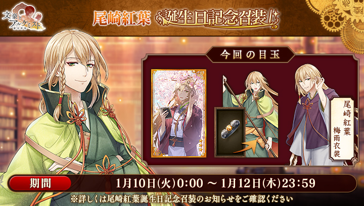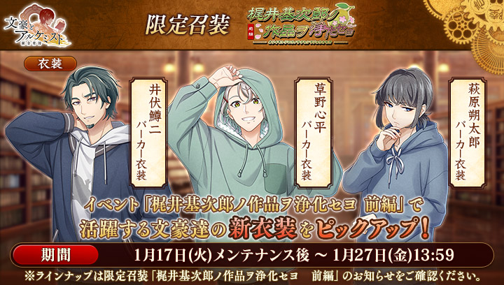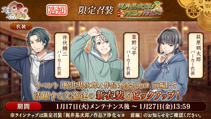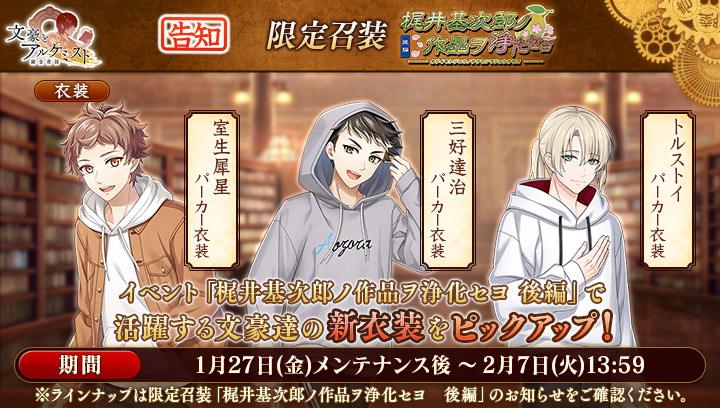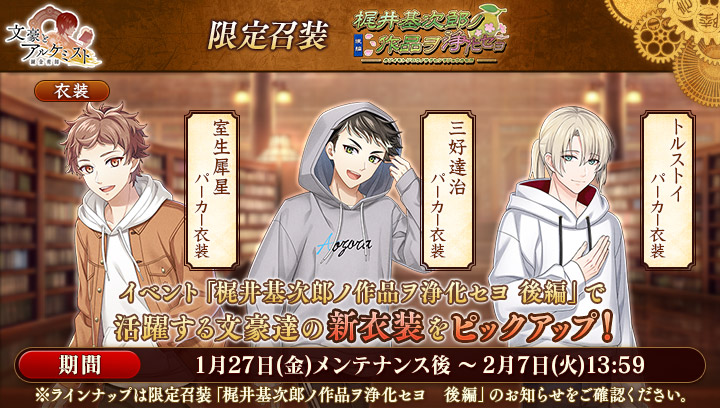 期間中、梶井基次郎の新衣装が獲得可能です。