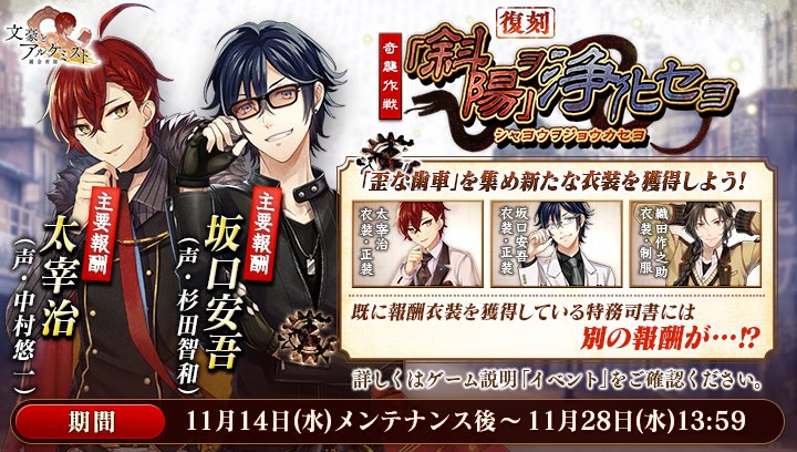 2017年11月8日(水)に開催した『奇襲作戦「斜陽」ヲ浄化セヨ』で特効として使用できた装像「斜陽ノ閃光-太宰治」について、イベントを復刻し本日開催した復刻『奇襲作戦「斜陽」ヲ浄化セヨ』で再度使用できる旨の記載がありませんでした。#文アル