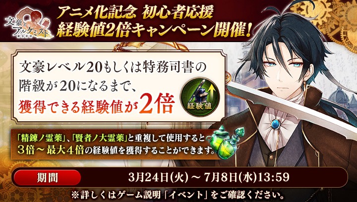 アニメ化記念 初心者応援経験値2倍キャンペーンを開始いたしました。#文アル