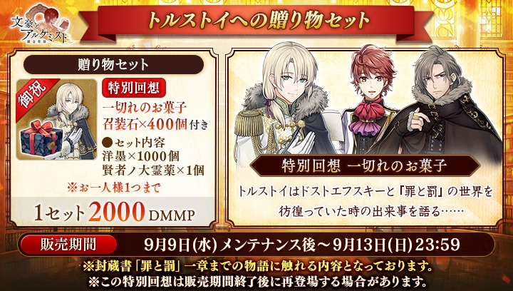 9月23日(水)メンテナンス後より、ドストエフスキー(CV:森川智之)が、期間中、有魂書より転生しやすくなります。この機会をお見逃しなく!#文アル
