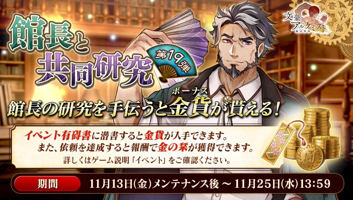 期間中、イベント有碍書に潜書すると内装などに使える金貨が入手できます。#文アル
