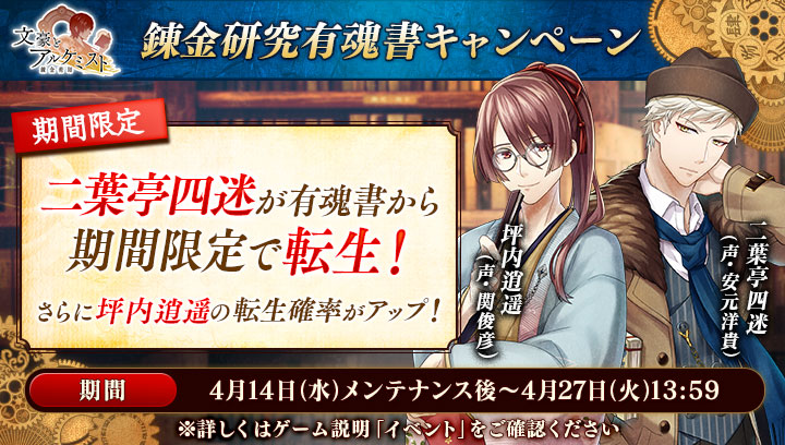 4月27日(火)メンテナンス後より、ゲーテ(CV:井上和彦)、フィッツジェラルド(CV:駒田航)、ヘミングウェイ(CV:黒田崇矢)、徳田秋声(CV:渡辺拓海)、泉鏡花(CV:神谷浩史)が、期間中、有魂書より転生いたします。この機会をお見逃しなく!#文アル