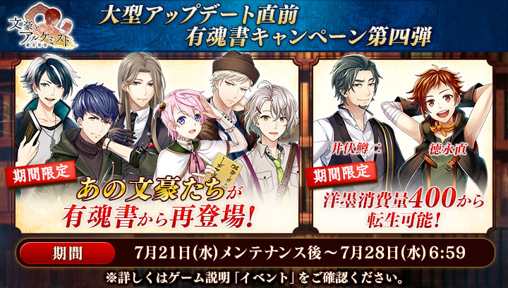 7月21日(水)メンテナンス後より、期間限定で対象の文豪が転生します。さらに、洋墨消費量400から井伏鱒二(CV:武内駿輔)、徳永直(CV:山下大輝)が転生可能になります。この機会をお見逃しなく!#文アル