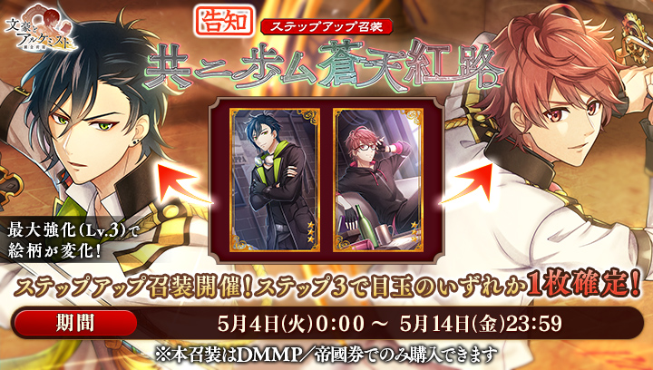 本ステップアップ召装では、DMMP(アプリ版の場合は帝國券)を消費し、期間限定の装像を獲得することができます。