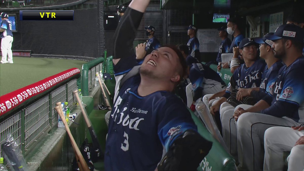 どすこい後ベンチでポーズをとる山川選手。(部) #seibulions