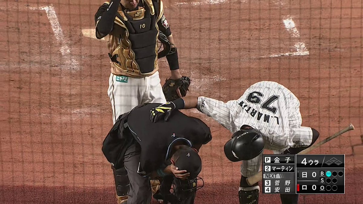 ボールがぶつかった審判の方を気遣う千葉ロッテ・マーティン選手。(部) #chibalotte