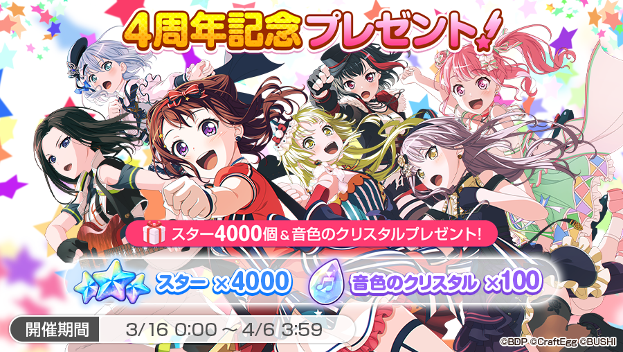 4月6日3:59までにログインで、「スター×4000」と「音色のクリスタル×100」 をプレゼントする「4周年記念プレゼント!」を開催中🎶