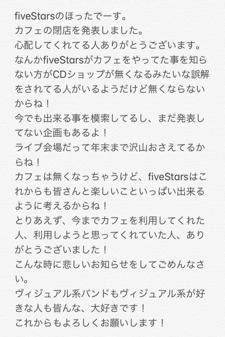 なんかfiveStarsがカフェをやってた事を知らない方がCDショップが無くなるみたいな誤解をされてる人がいるようだけど無くならないからね!