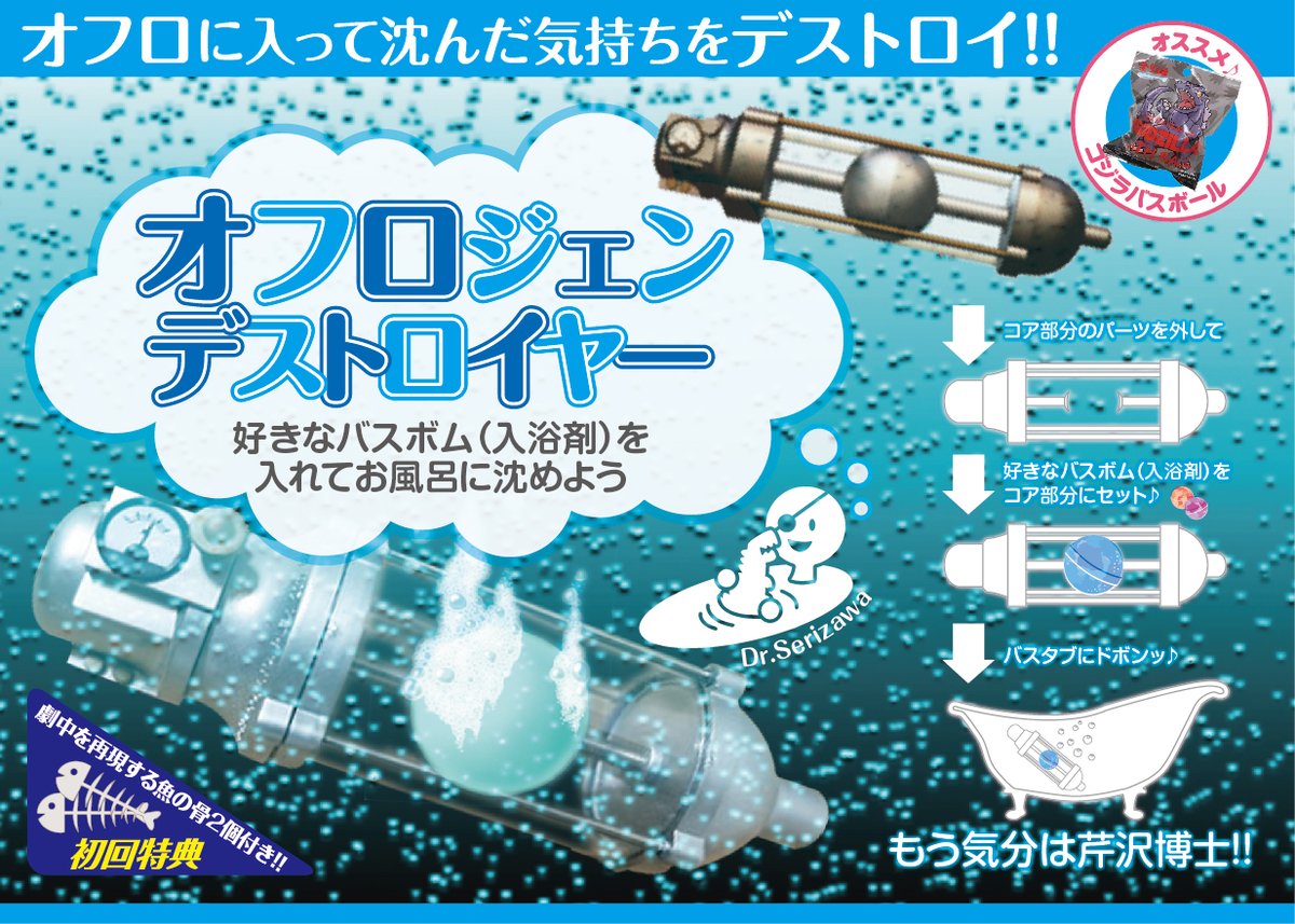 こんにちは黒猫本舗です バスボムが追加発売ということで“オフロジェンデストロイヤー”をもう一度告知させてね笑 お風呂が楽しくなるオキシジェンデストロイヤー型のアイテムです なんと!!特典で魚の骨も付いてきます笑 まぁフェイクなんすけどね😅 ホントに発売しないかなー🤣