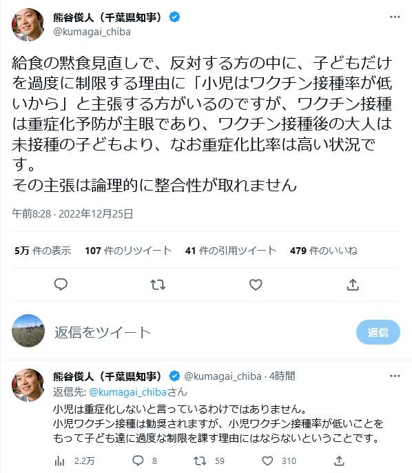 千葉県知事に物申すなら学校の黙食とりやめるまえに小児のワクチン接種率をせめて7~8割程度まで引き上げる、学校に空気清浄機やサーキュレーターなど複数のデバイスを使って換気をすることなどがあるのにすっ飛ばして緩和だけするというのはあらゆる方面に喧嘩売るようなもん。