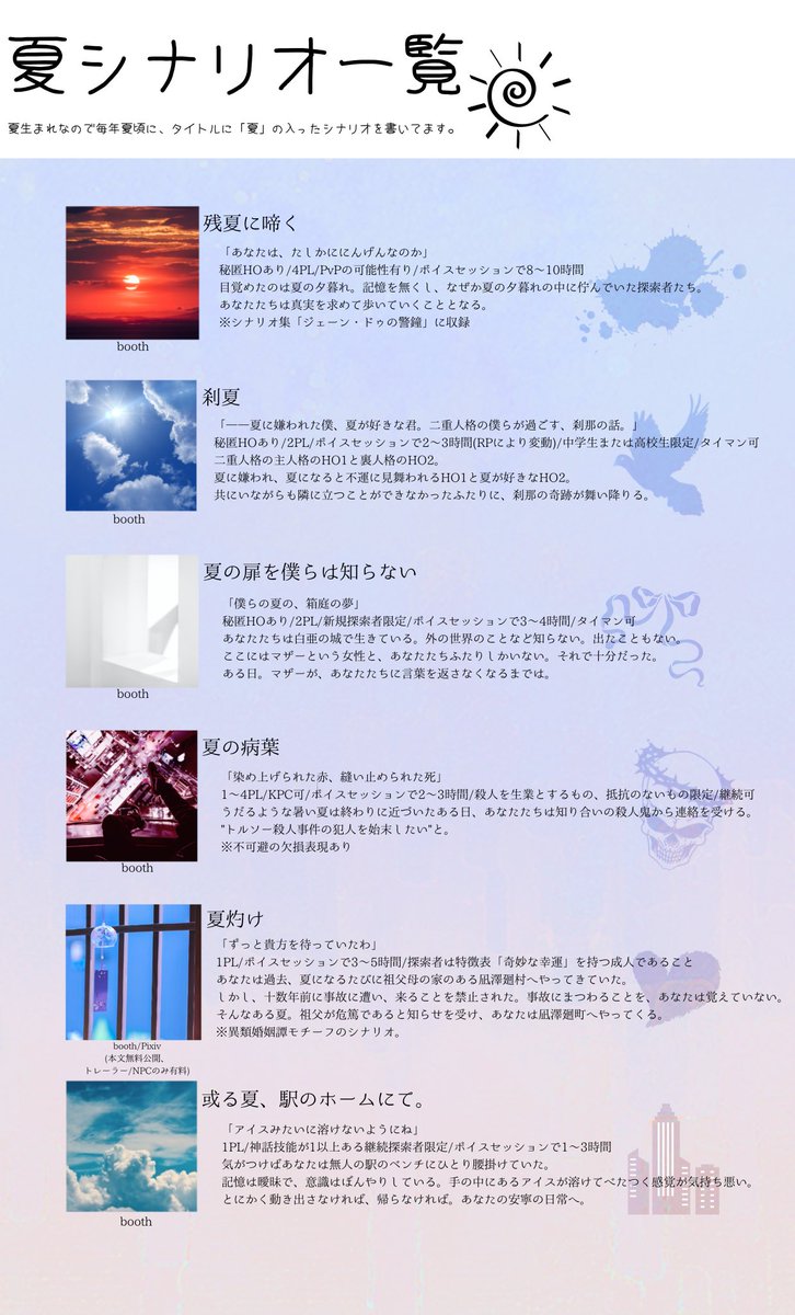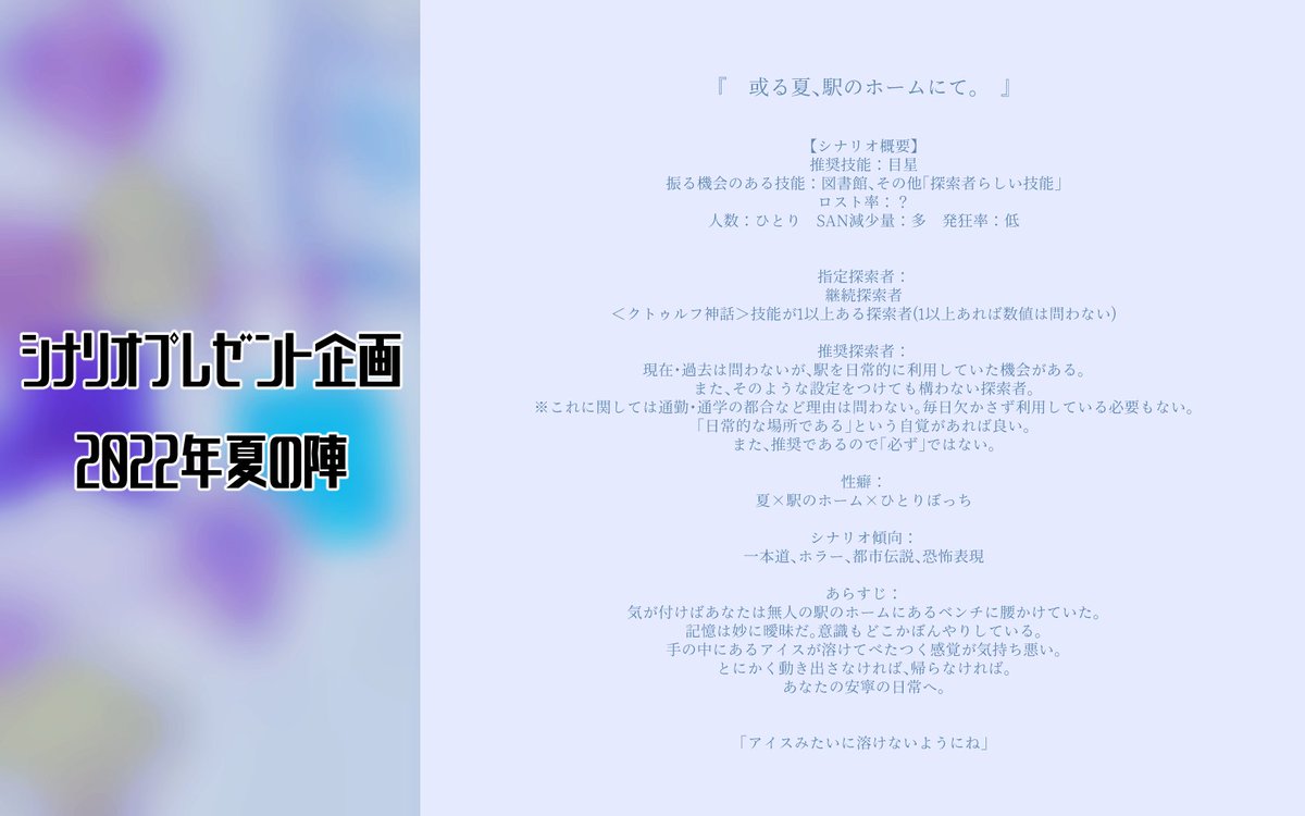 毎年夏になるとシナリオを書く縛りをしています。無料公開シナリオもあるので良ければ夏にでも遊んでやってください。