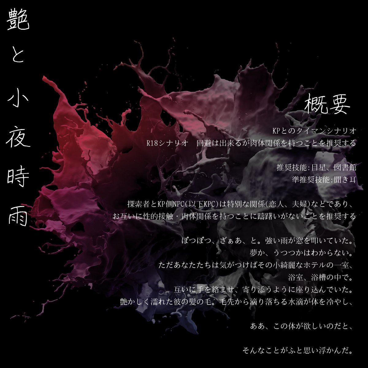刑事または探偵など、調査や捜査が出来る探索者向けのタイマンシナリオです。