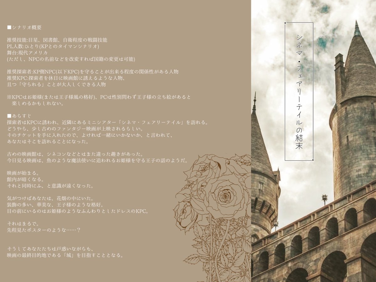 いつも通りに過ごしていたはずなのに別の場所に迷い込み、同じようで違うKPCとファンタジー世界を旅するタイマンシナリオです。