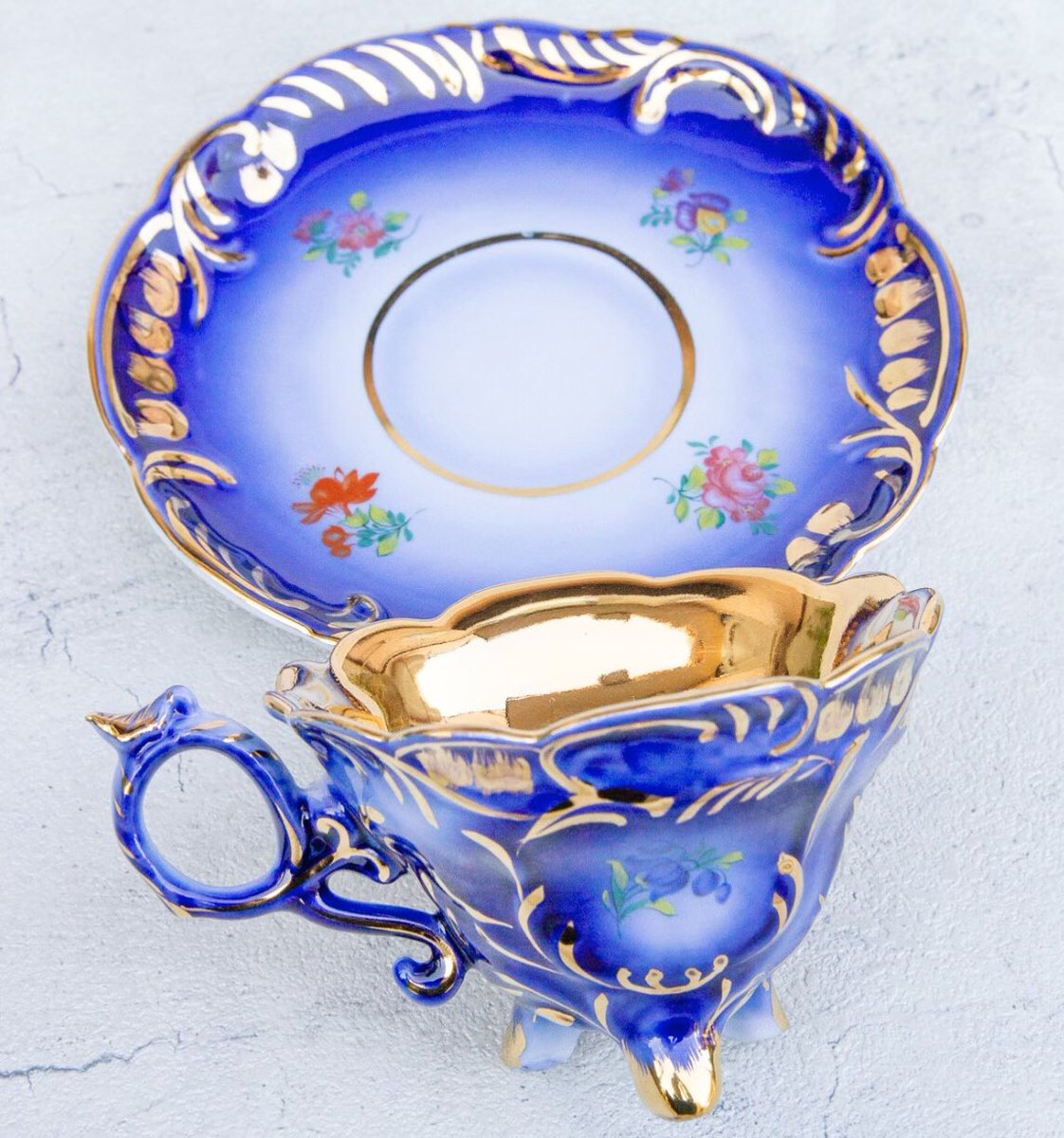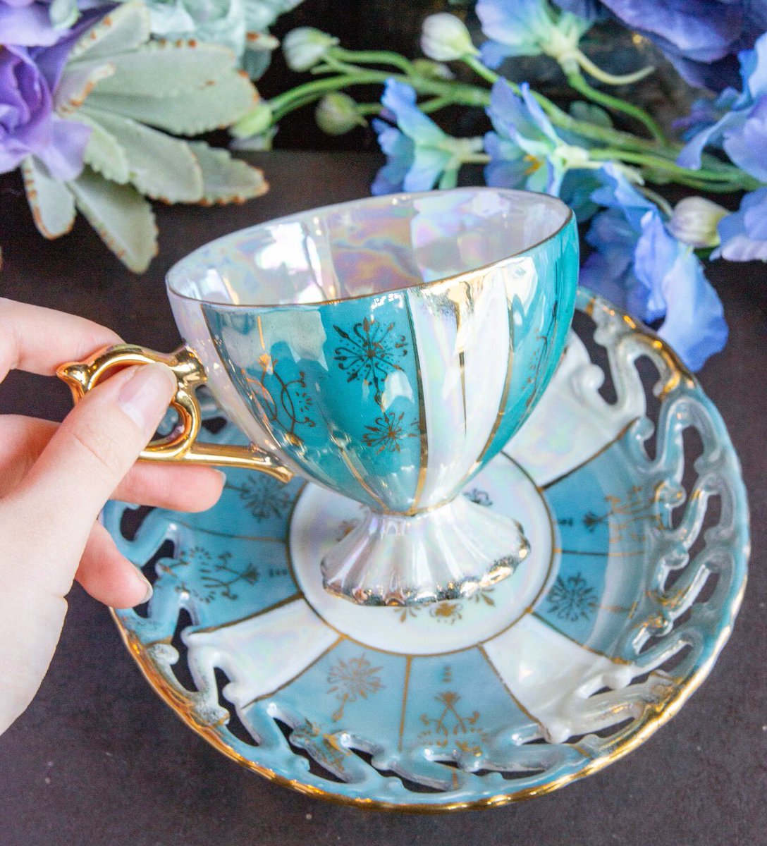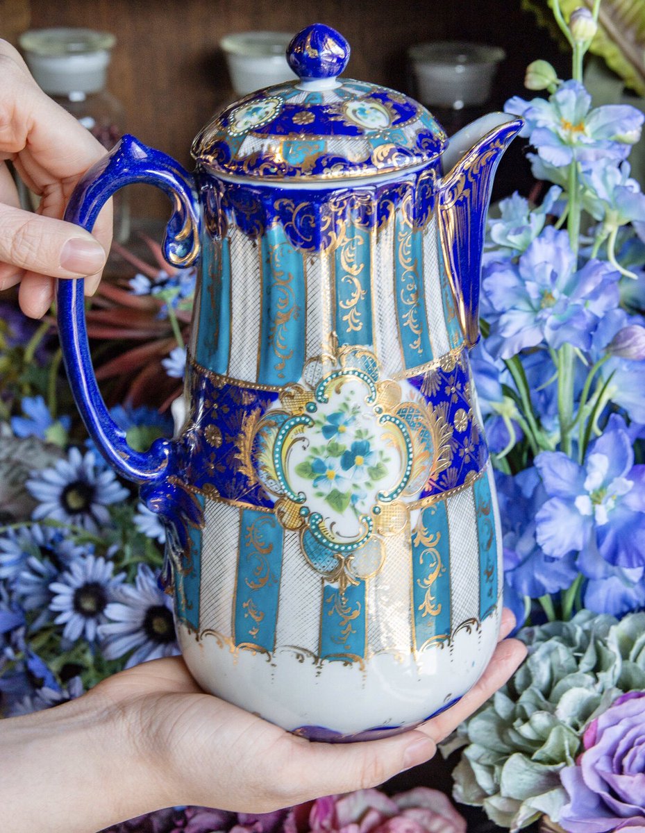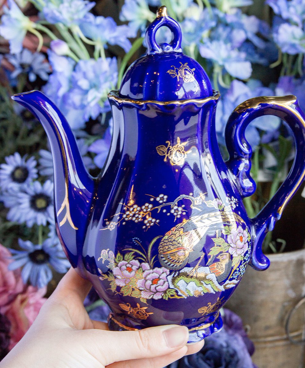 ロイヤルブルーと花柄のティーカップの美品が再入荷しました。写真は青いバタフライピーティーを注いだ状態です。そのほか本日追加の商品を後ほどご紹介します。wondertrip.shop-pro.jp/?mode=srh&keyw…