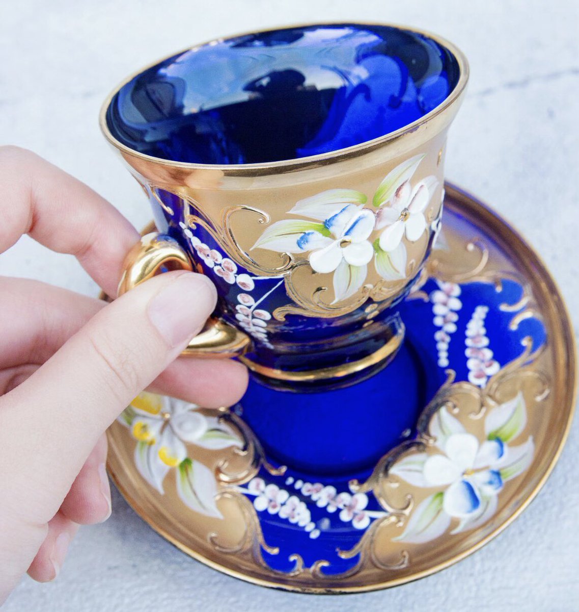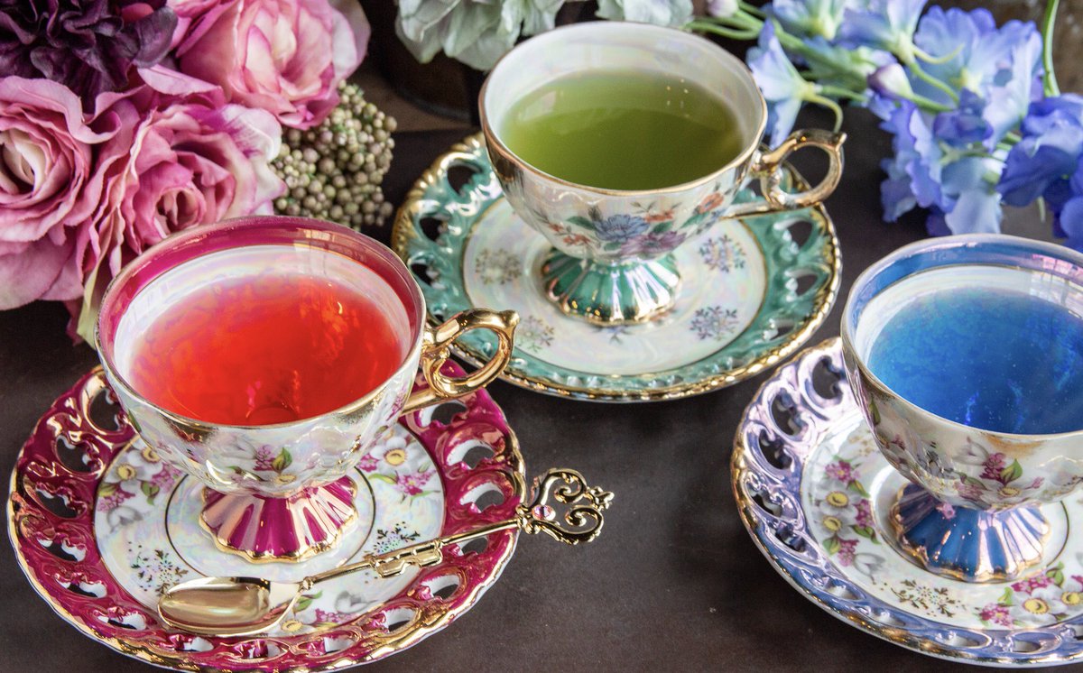 ロイヤルブルーと花柄のティーカップの美品が再入荷しました。写真は青いバタフライピーティーを注いだ状態です。そのほか本日追加の商品を後ほどご紹介します。wondertrip.shop-pro.jp/?mode=srh&keyw…