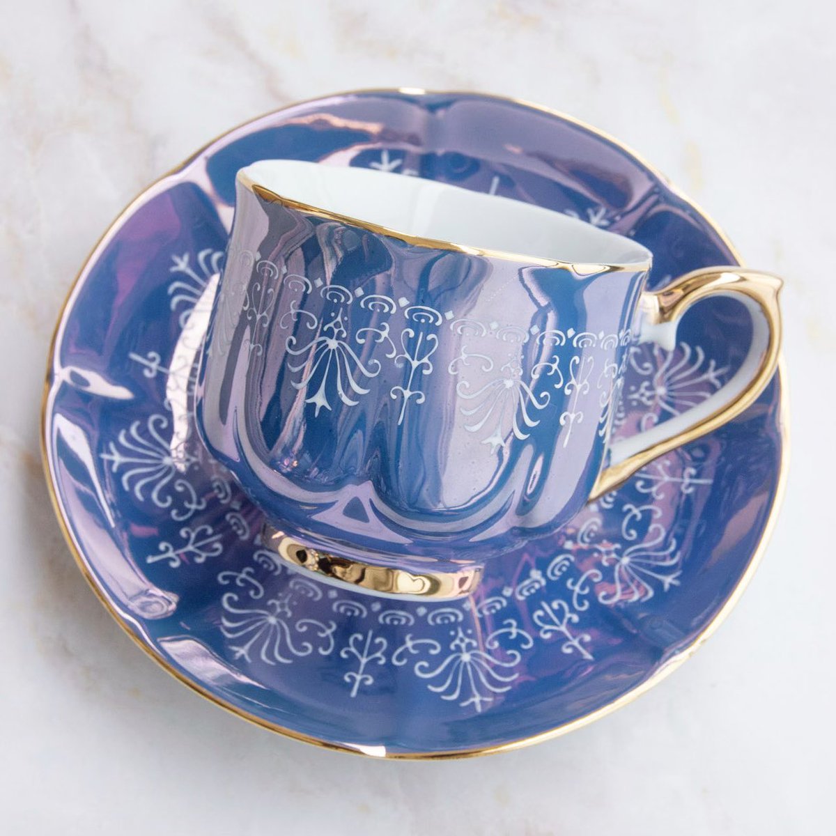 ロイヤルブルーにレース風の白い模様が入ったカップ&ソーサーを掲載しました。wondertrip.shop-pro.jp/?mode=srh&sort…