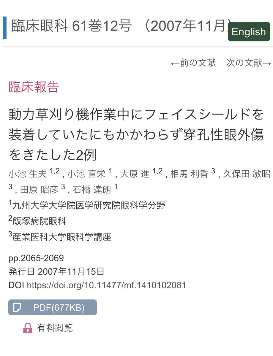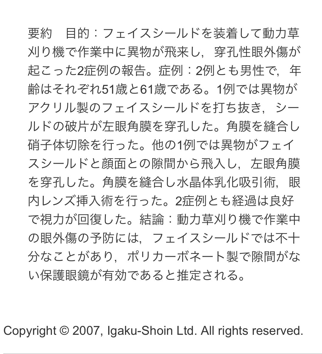そろそろ草刈りの季節ですが、動力付き草刈り機を使う時は必ずポリカーボネートのゴーグルしてください。思わないところの石に当たって壊れた刃が目に入ると失明につながります。フェイスシールドではダメです。これ、日本中(多分世界中)の眼科医からのお願いです。