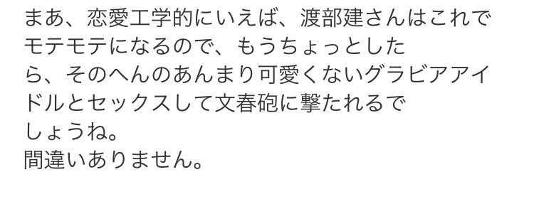 アンジャッシュ渡部建のスキャンダルの件。もし不倫だったら3年前のメルマガの通りやな。恋愛工学、恐るべし。 (出典: 週刊金融日記 第262号)