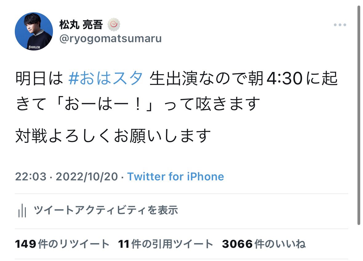 明日は #おはスタ 生出演なので朝4:30に起きて「おーはー!」って呟きます