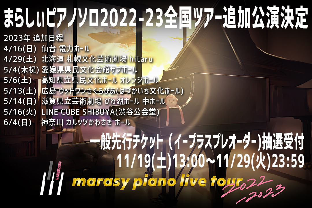 まらしぃ🎹全国ツアー追加公演先行チケット(抽選)受付11/29(火)23:59まで