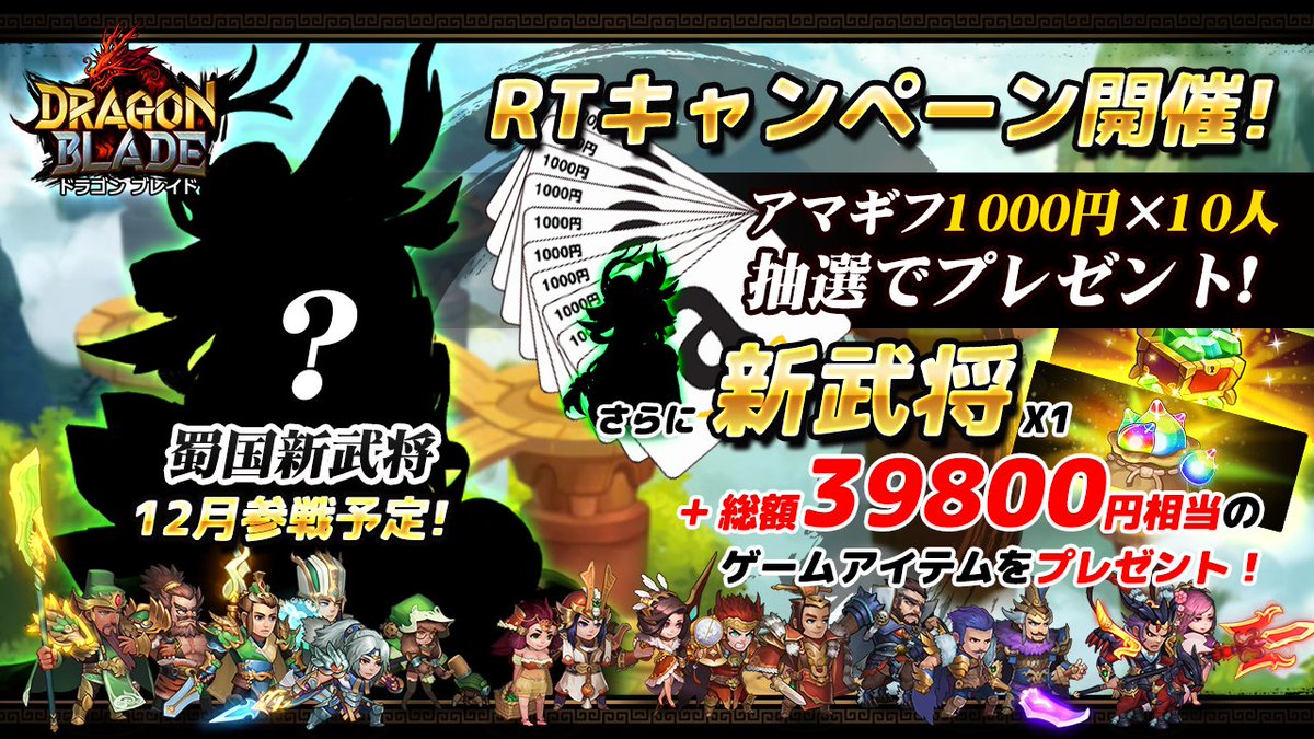 抽選で10名様に1,000円分のアマギフと新武将x1、総額39,800円分のゲームアイテムをプレゼント!