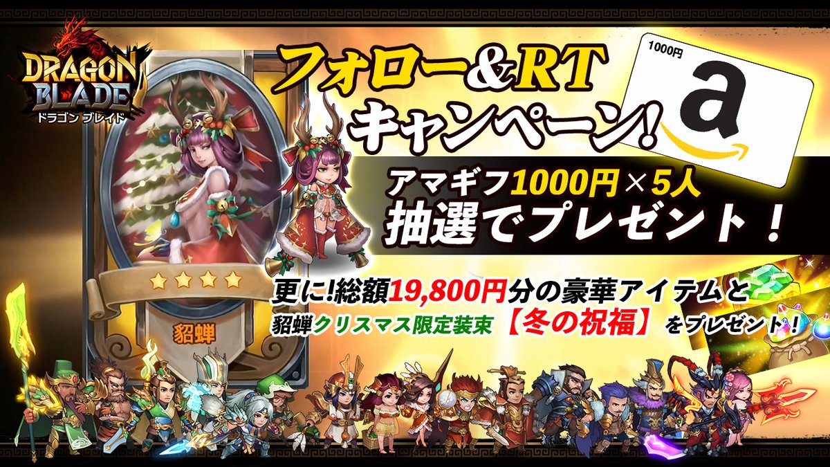 抽選で5名様に1,000円分のアマギフと貂蝉クリスマス限定装束、総額19,800円分のゲームアイテムをプレゼント!