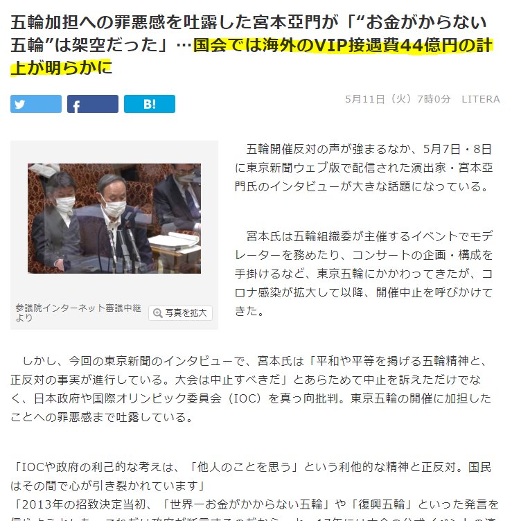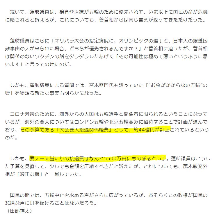 東京五輪について、国会中継で「海外からのVIP接遇費である『大会要人接遇関係経費』が約44億円、予算計上。VIP一人当たり5500万円」との指摘がありました。