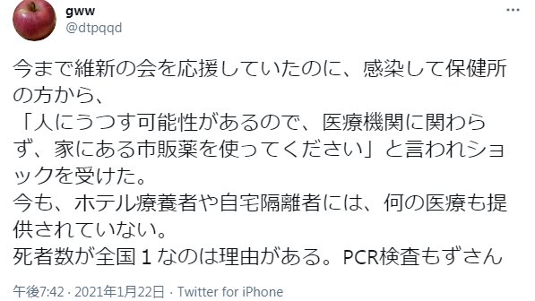大阪では、保健所から「人にうつす可能性があるので、医療機関に関わらず、家にある市販薬を使って」との指導があり、「ホテル療養者や自宅隔離者には、何の医療も提供されていない」との指摘です。