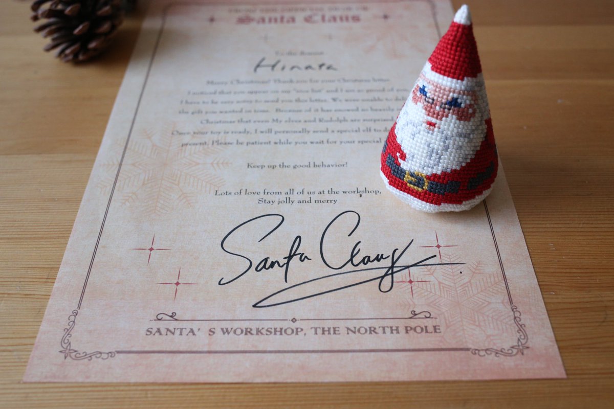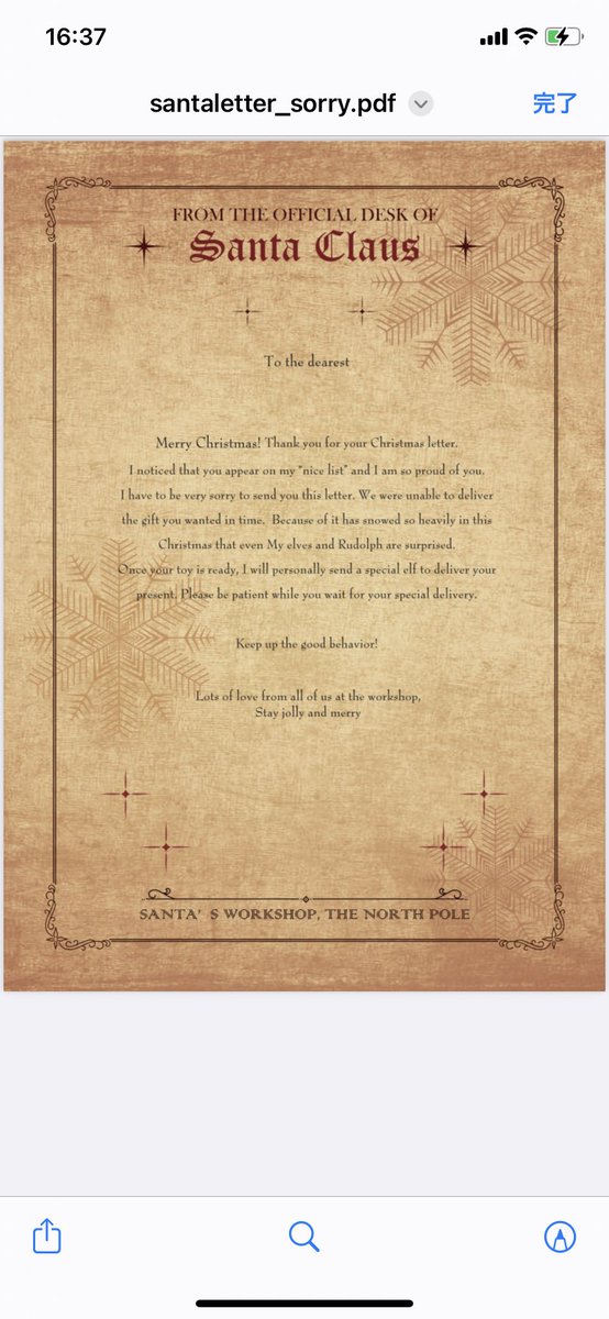 PDFをDLしてA4用紙にプリントアウトしたら、To the dearest 下の空白にお子さんのお名前を。下の空いてるところにサンタさんのサイン(Santa Claus)を書いてください。読みにくいと尚GOOD🎅