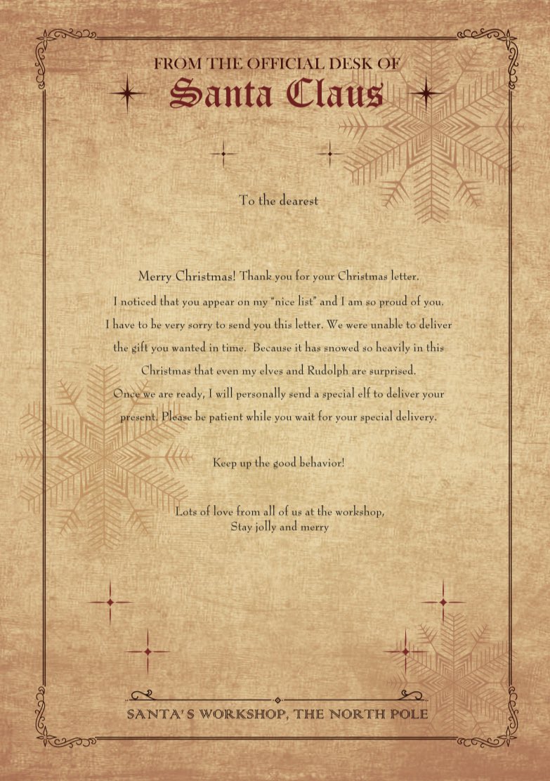 久々にnoteを書きました。大雪でクリスマスプレゼントが間に合いそうになくて困っているパパママへ。プリントアウトして使えるお手紙の説明と日本語訳をのせています。3年前に代筆した金券を贈る英文も。