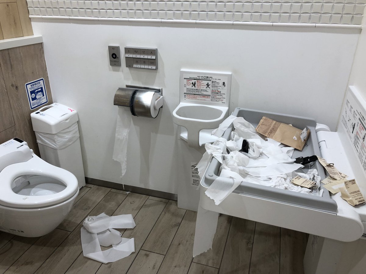 ベビーのオムツ替えが出来るトイレスペース。買ったものをここで開けてここまで全て放置していく人って多分日本人じゃないよ…