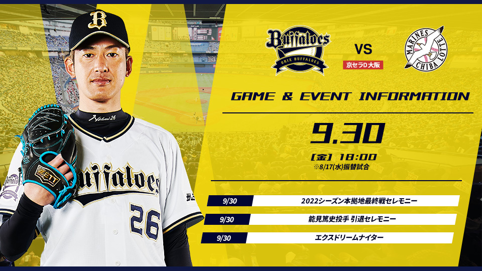 9/30(金)京セラドーム大阪で開催される試合&イベント情報について、お知らせいたします。