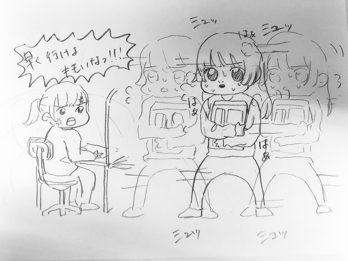 カットのチェックしてほしくて動検さんのところに行こうか今はやめとこうか判断できず反復横跳びしてる僕と僕にキレる同期を描きました。