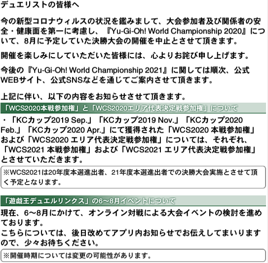 新型コロナウィルスの状況を鑑みまして、大会参加者及び関係者の安全・健康面を第一に考慮し、『Yu-Gi-Oh! World Championship 2020』について、8月に予定していた決勝大会の開催を中止とさせて頂きます。