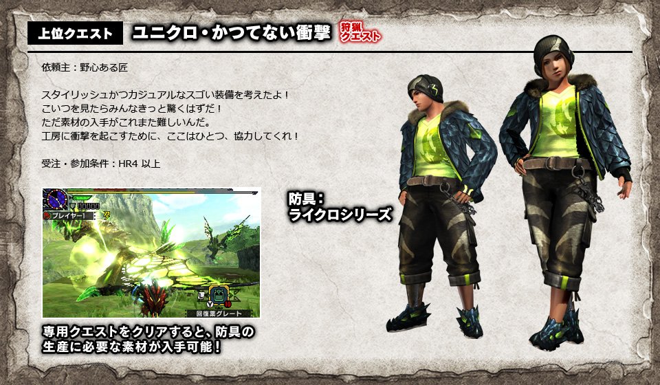 モンスターハンタークロスとユニクロのコラボクエストが本日から配信されています~。この画像のアイルーちゃんが身に着けているTシャツは、コラボTシャツとして実際に販売中なんですよ~!bit.ly/22rmoCv