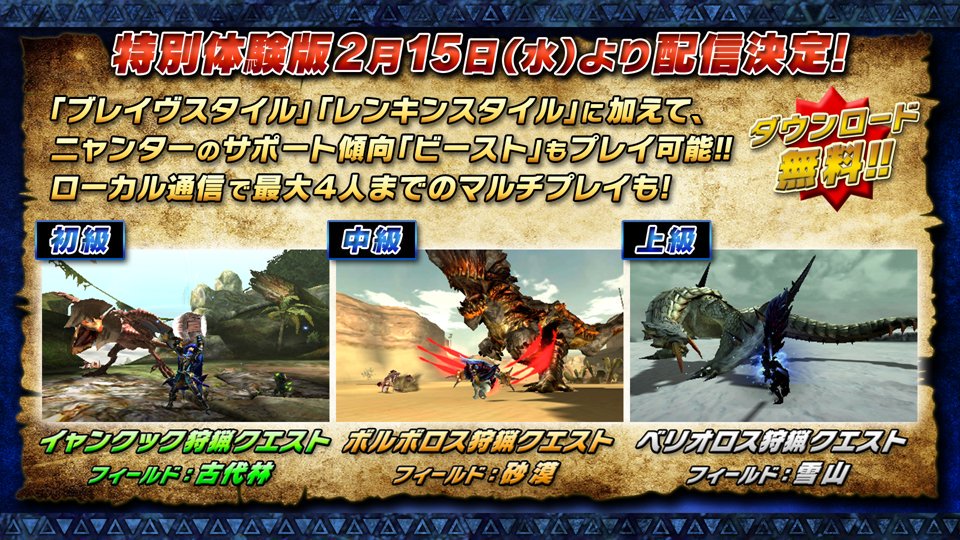 ハンターの皆さん、お知らせです~!3月18日発売『モンスターハンターダブルクロス』ですが特別体験版が2月15日(水)から配信されます!最大4人でマルチプレイもできちゃいます!capcom.co.jp/monsterhunter/… #MHXX