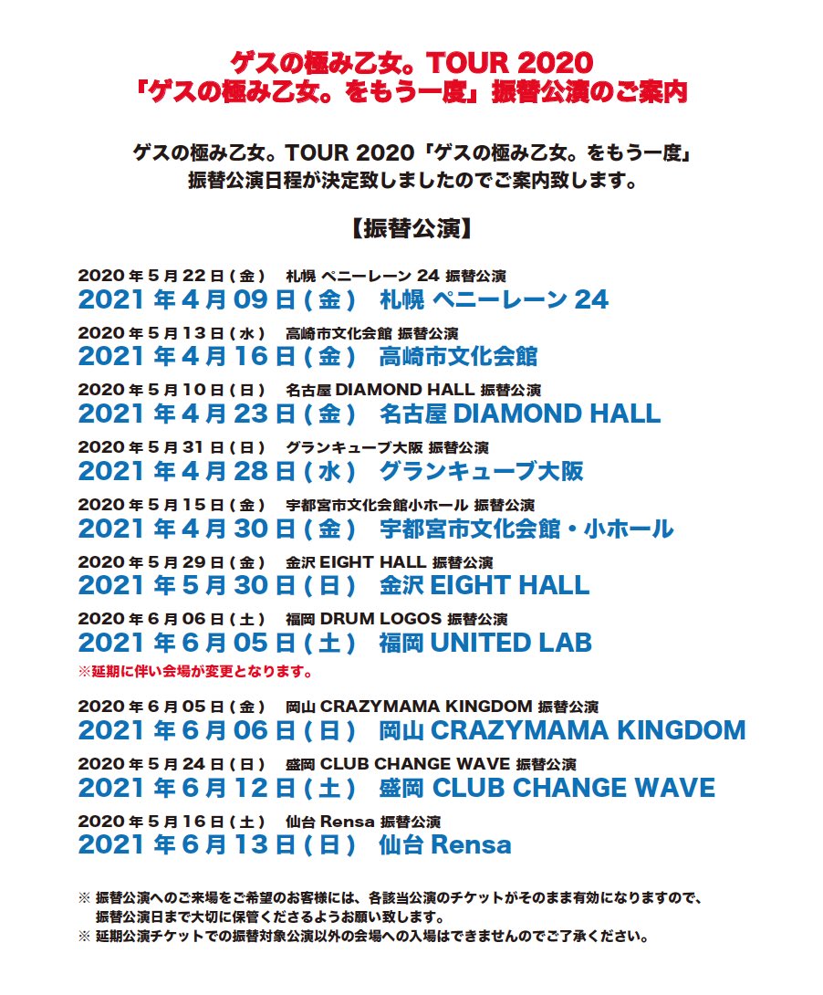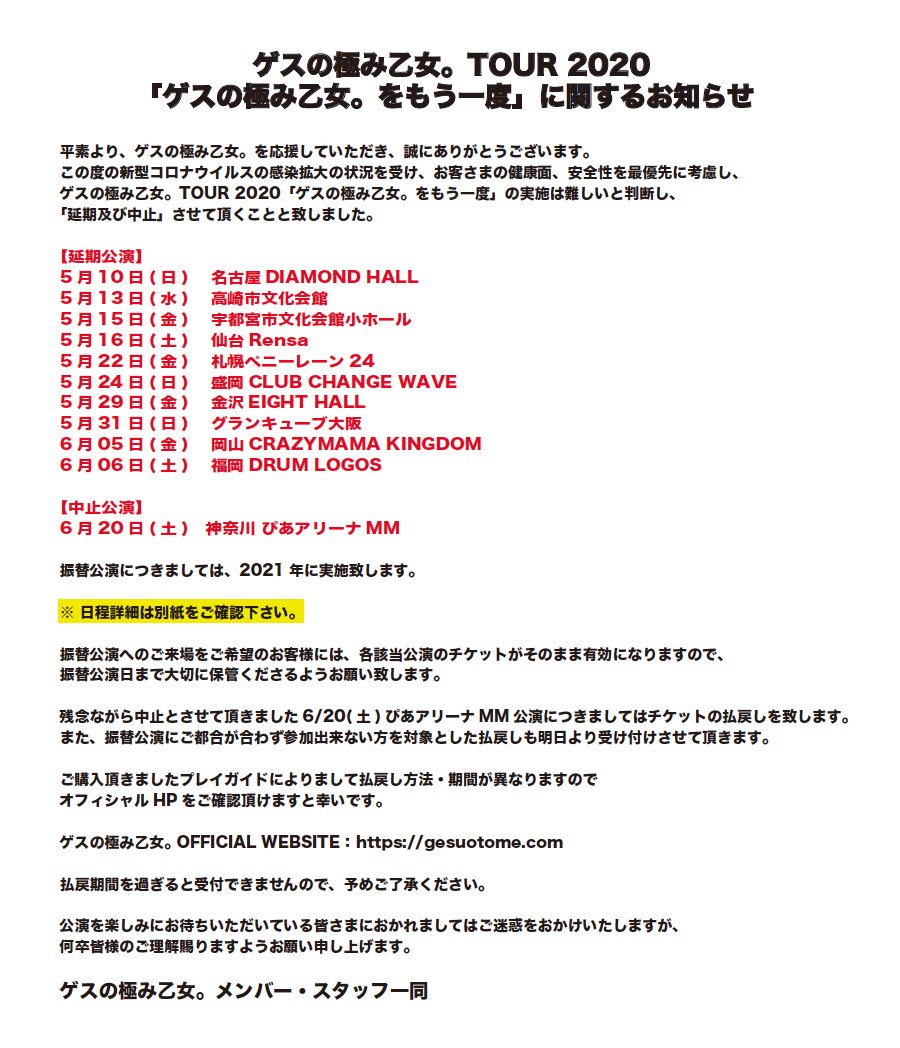 ワンマンツアー「ゲスの極み乙女。をもう一度」を延期及び中止させて頂く事となりました。
